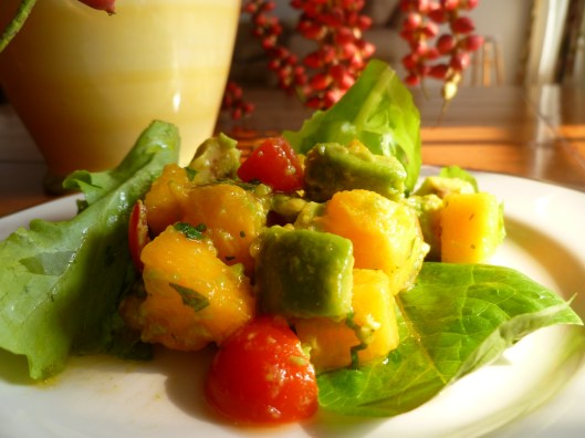 2. Add the green onions and cilantro to the salad and 8 drops of hot sauce–one for each plate of salad. Mix everything together gently. (Very ripe papayas are delicious but not sturdy. The same is true of some varieties of avocados.)