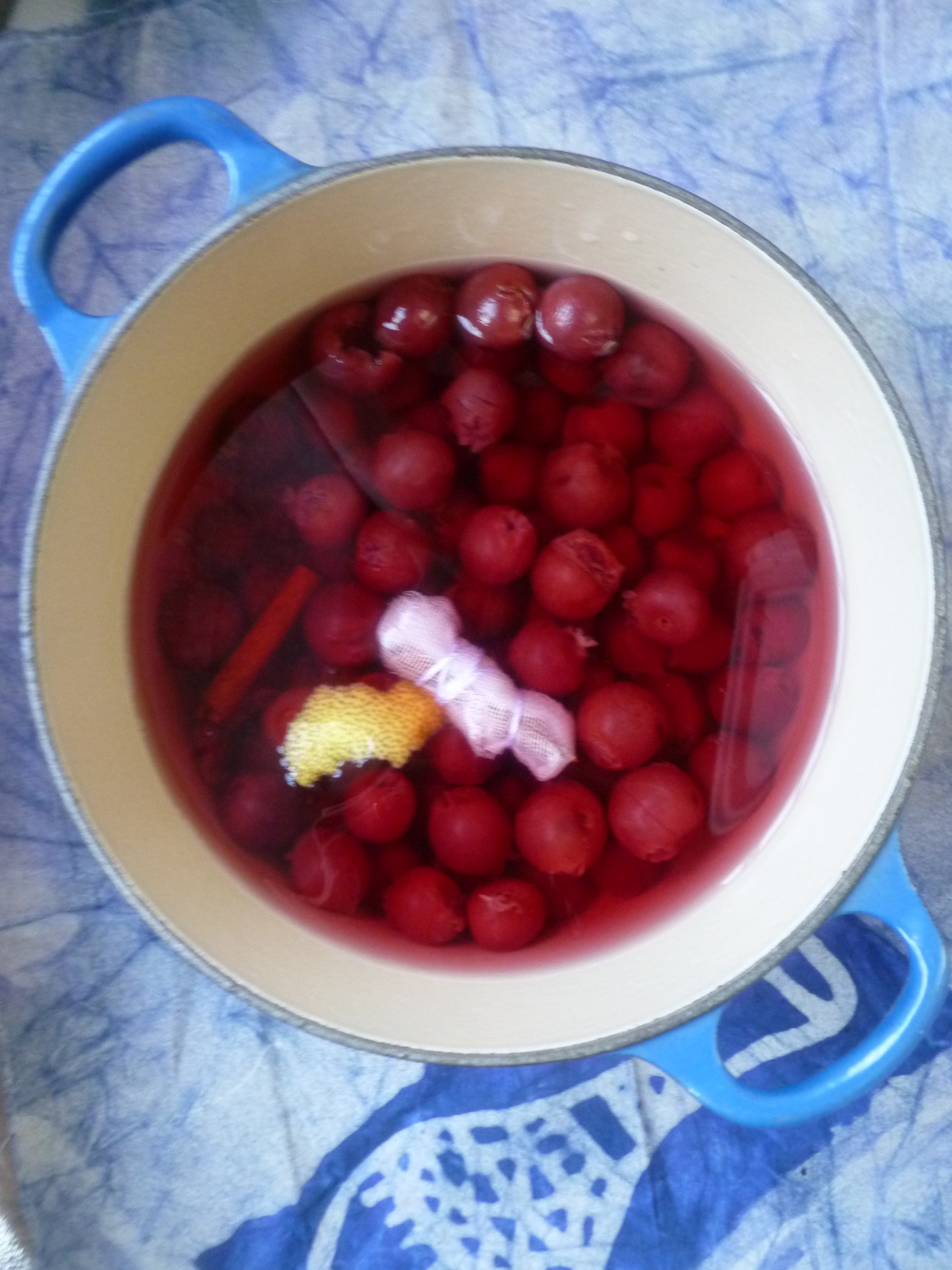 2. Put the cherries in the pot, along with the strip of lemon peel, the cinnamon sticks, 3 Tablespoons of sugar (for sweetened cherries) and 2 cups of water. Be conservative with the sweetening at this point. Some of the reserved cherry juice will be added later and will sweeten the soup a little more. (Because one of the cinnamon sticks used in the photographed soup had broken into several pieces, it was wrapped in cheesecloth before being placed in the pot.)