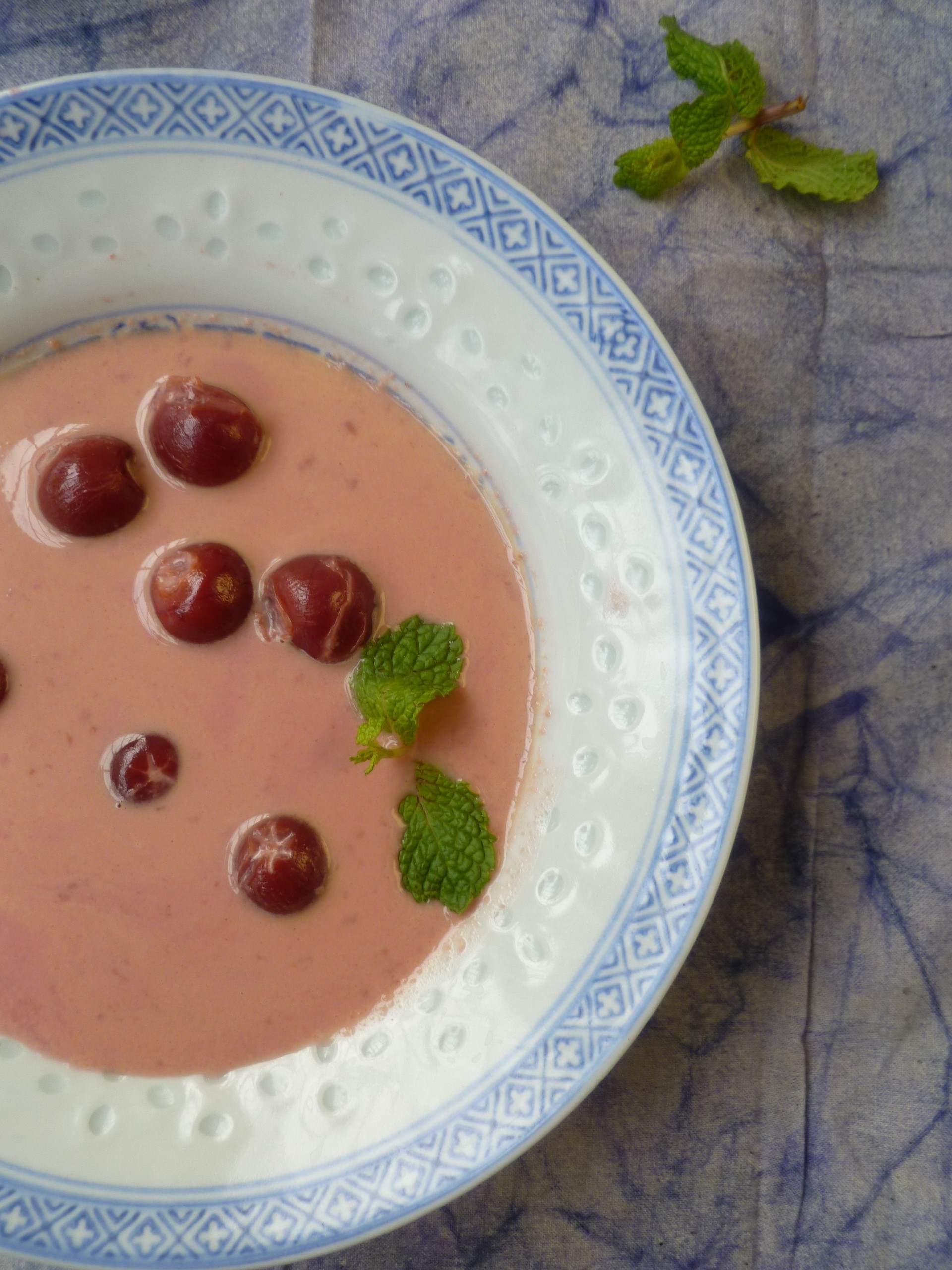 5. With a slotted spoon, remove enough cherries to measure 200 grams (or about 3/4 cup measured into a liquid measuring cup). Purée them in a food processor or blender and return them to the soup pot. Use a little of the liquid in the pot to rinse the last bit of cherry purée off the sides of the processor or blender and pour it into the pot.