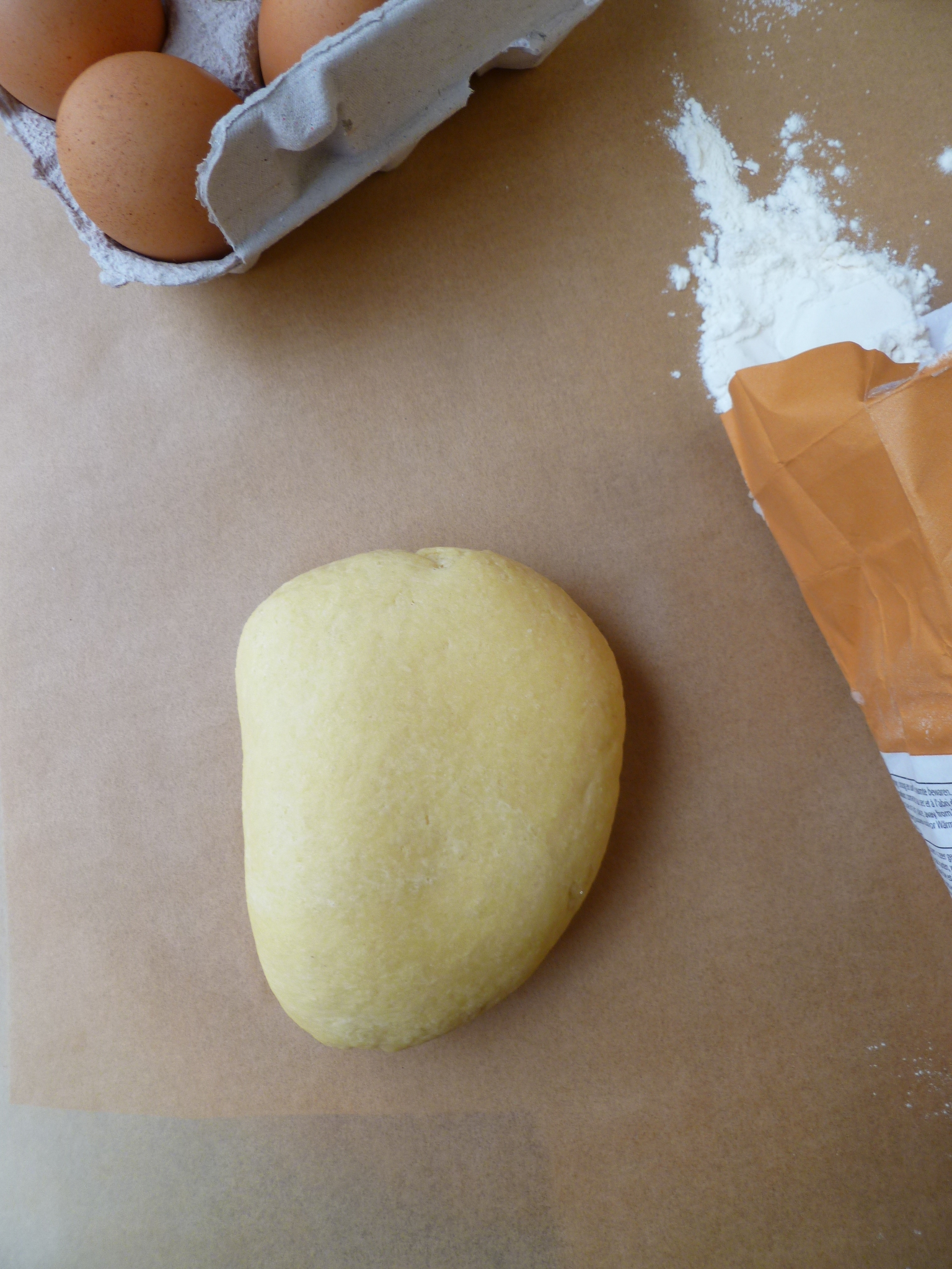 1. To make the dough by hand. Mix the flour and salt together in the bowl. Make a well in the center of the flour and pour in the eggs. Mix the eggs and flour together with your hands. Press and squeeze the mixture to combine it and when it is still ‘scrappy’ turn it out on the pastry board to knead. Use your fists on the mixture, pressing down on it and kneading it vigorously. Forming the dough will take time, but eventually the flour and eggs will form a smooth, dry ball.