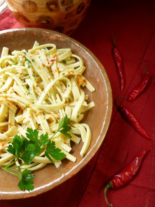 If the noodles are being served plain, at the side of a main course, a branch of fresh parsley and a fresh red chili arranged on them in the serving bowl or on individual plates will look pretty.