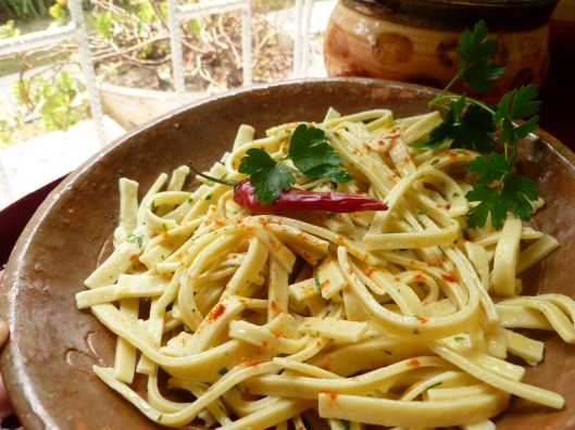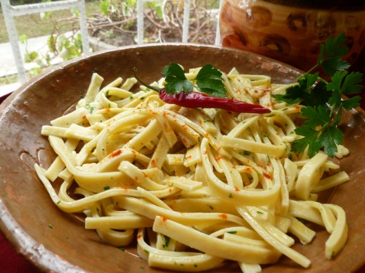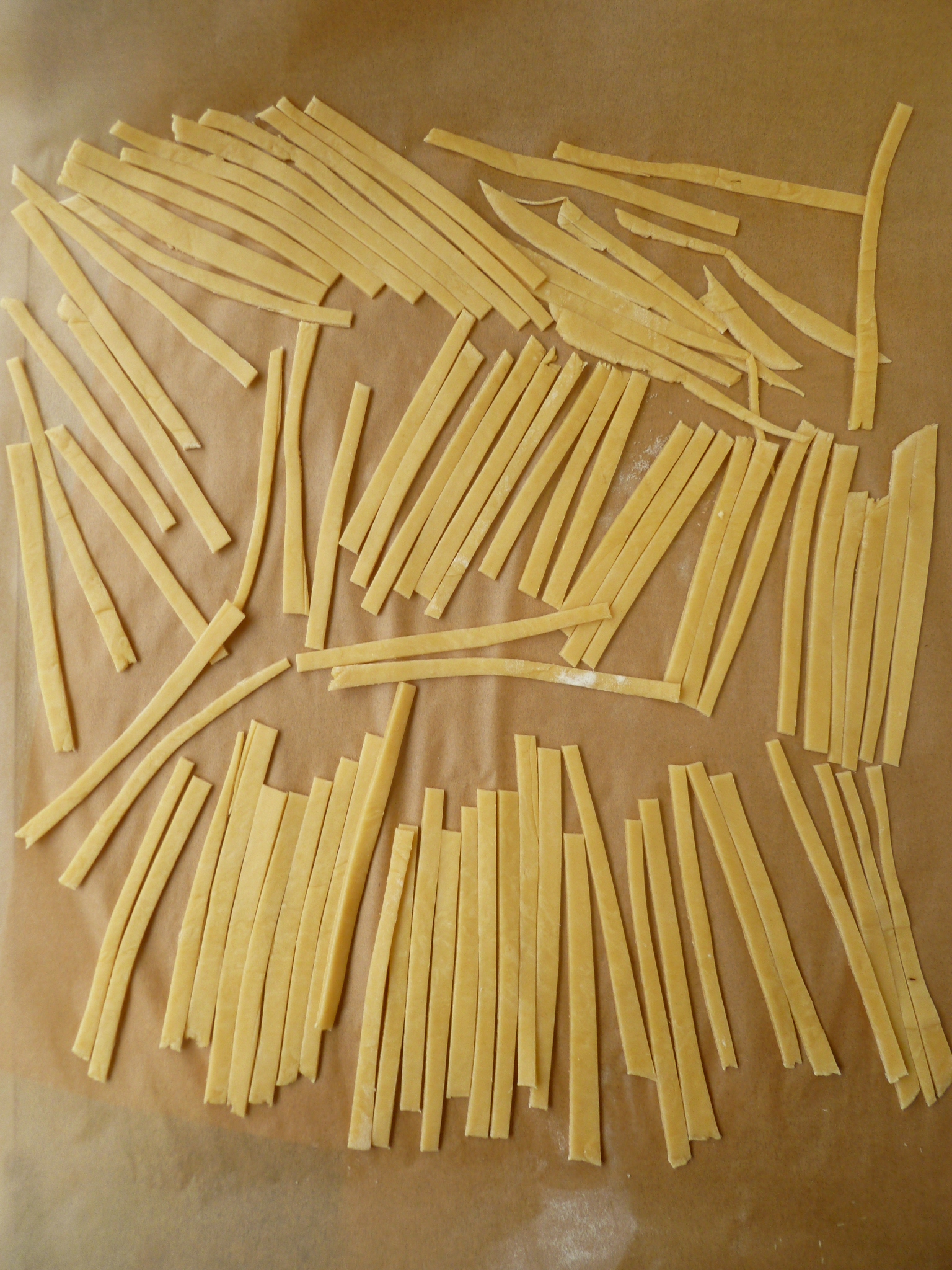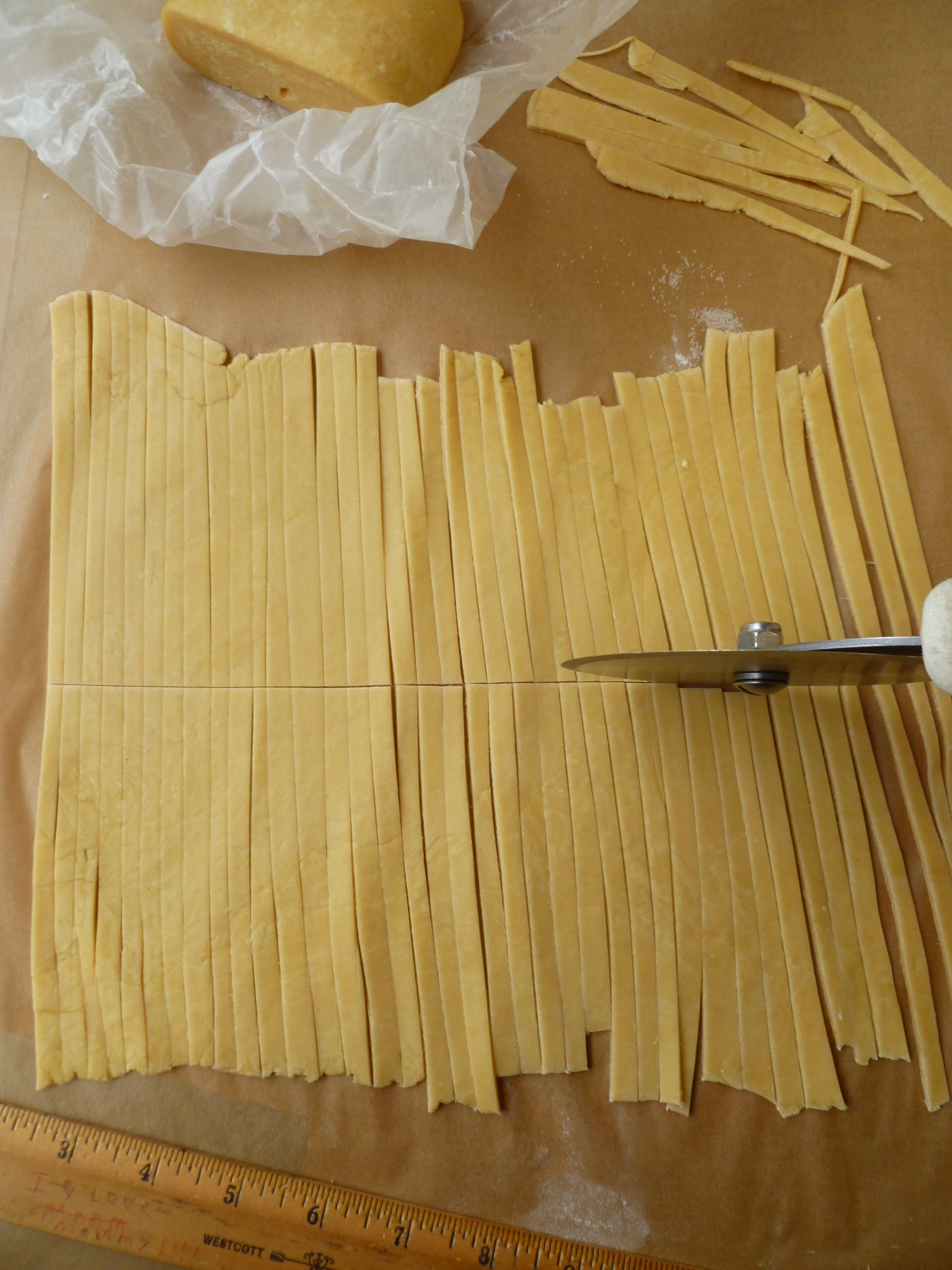 A Timing Note: The noodles may be made, dried for an hour and cooked. Or, they may be made a day ahead and dried overnight. They should be cooked just before serving.