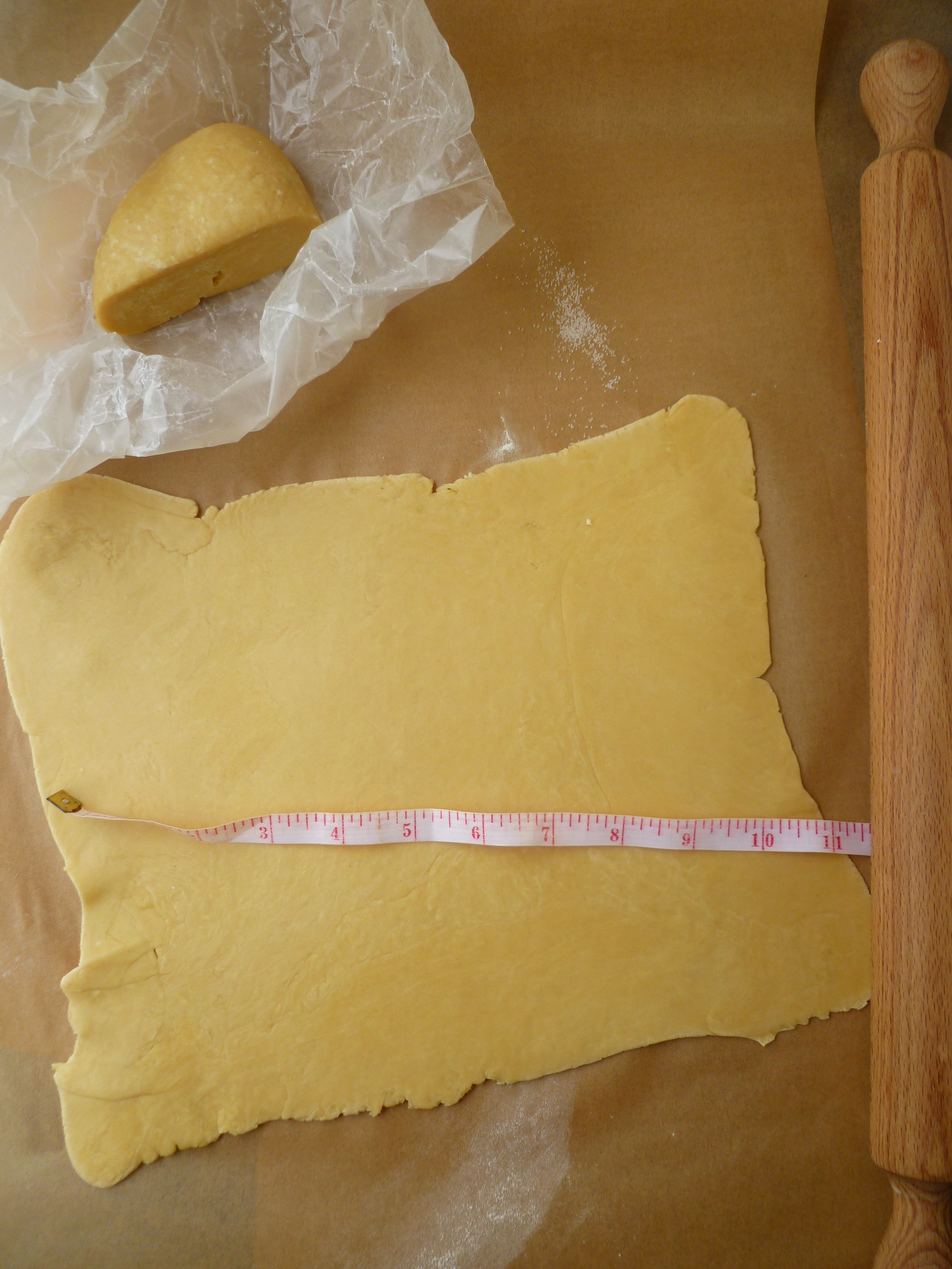 3. Cut the dough in half and roll out half of it on a lightly floured pastry board. (Have extra flour on hand in case the dough begins to stick–but it is unlikely to do so.) Roll the dough as thinly as possible–(between 1/8 and 1/16-inch thickness is about right)–into a rough rectangle measuring about 9-inches by 10-inches. Roll the dough from the middle, outwards, so that the edges of the rectangle do not become significantly thinner than its center. The dough may have a tendency to shrink back as it is rolled out. Flip it now and then as you form it.