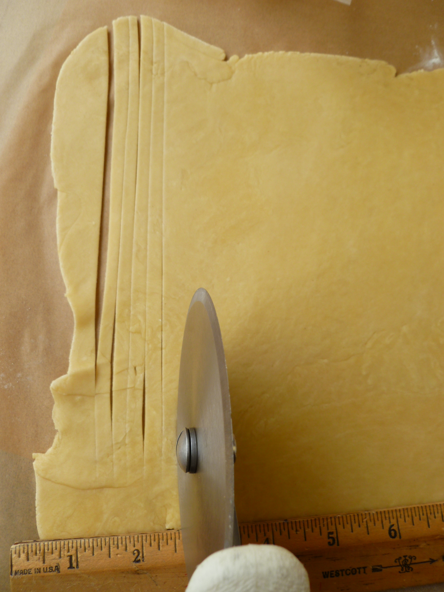 4. Place a ruler or measuring tape at the edge of the rectangle of dough to serve as a guide as you cut it into noodles (1/4-inch in width) with a pizza cutter or knife: