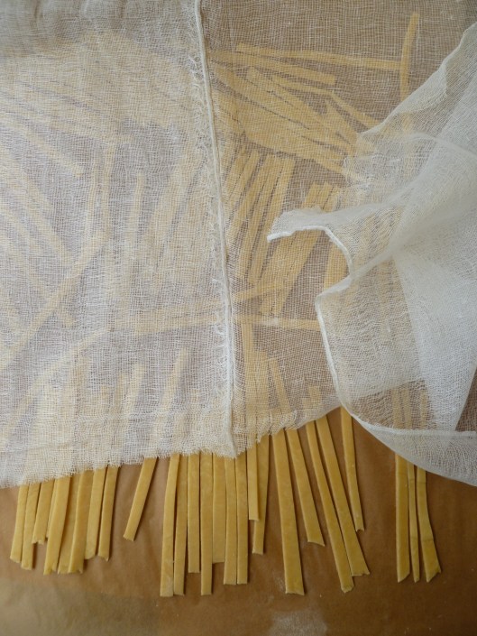 7. Cover the trays of noodles lightly with cheesecloth or linen towels. Dry them at room temperature (preferably a cool, dry-ish one) for at least an hour, or overnight: