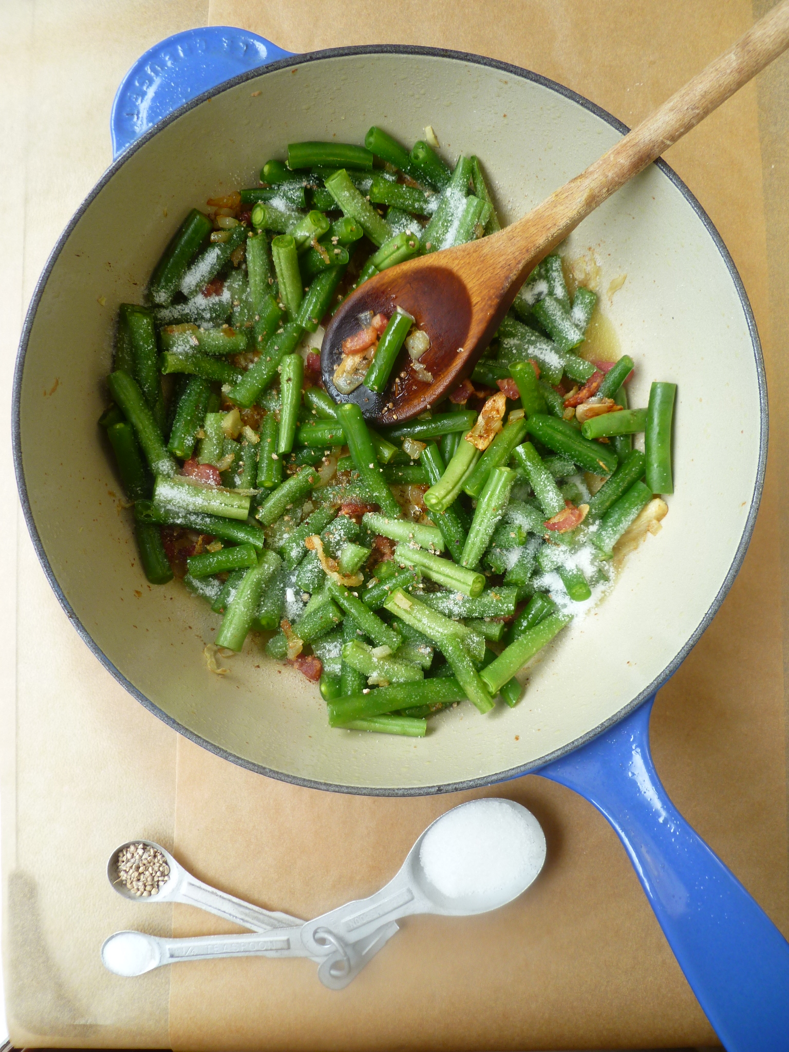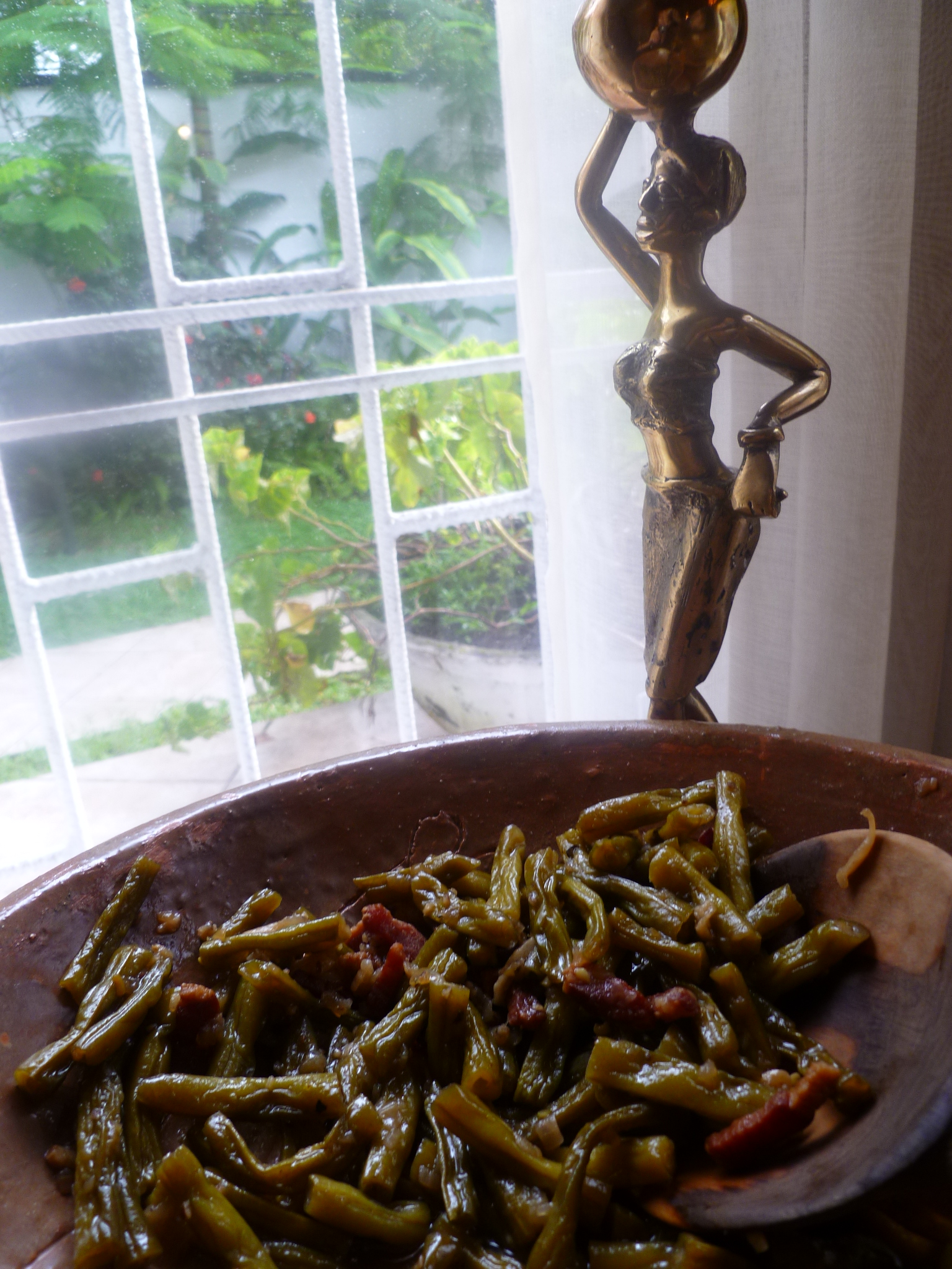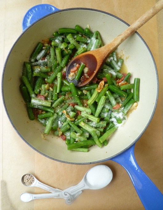 haricots verts braisés avec lardons, slow-cooked green beans, Thanksgiving vegetable recipe, vegetable side dish, vegetable with bacon recipe, winter vegetable dish