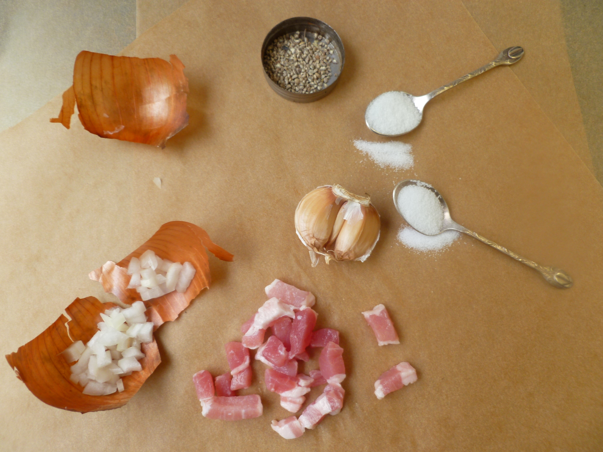 - about 2 ounces or 3 heaping Tablespoons of chopped Bacon or Lardons (small strips of bacon cut into matchsticks or small cubes)