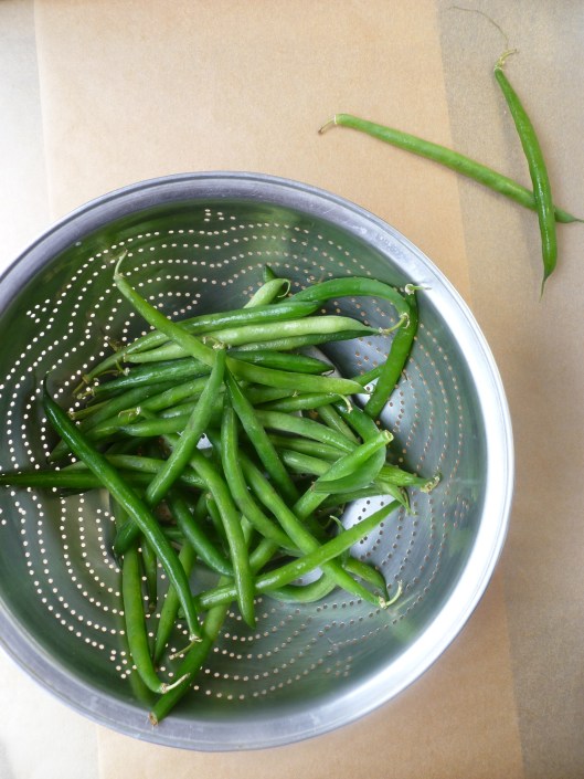Braised Green Beans with Bacon (for 6 – 8 people…For 4 people, reduce the quantity of green beans by half and leave the quantities of everything else the same.)