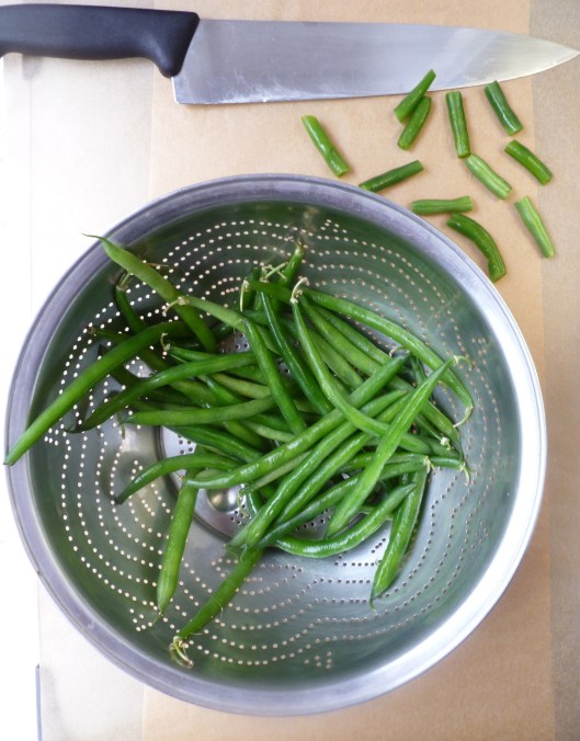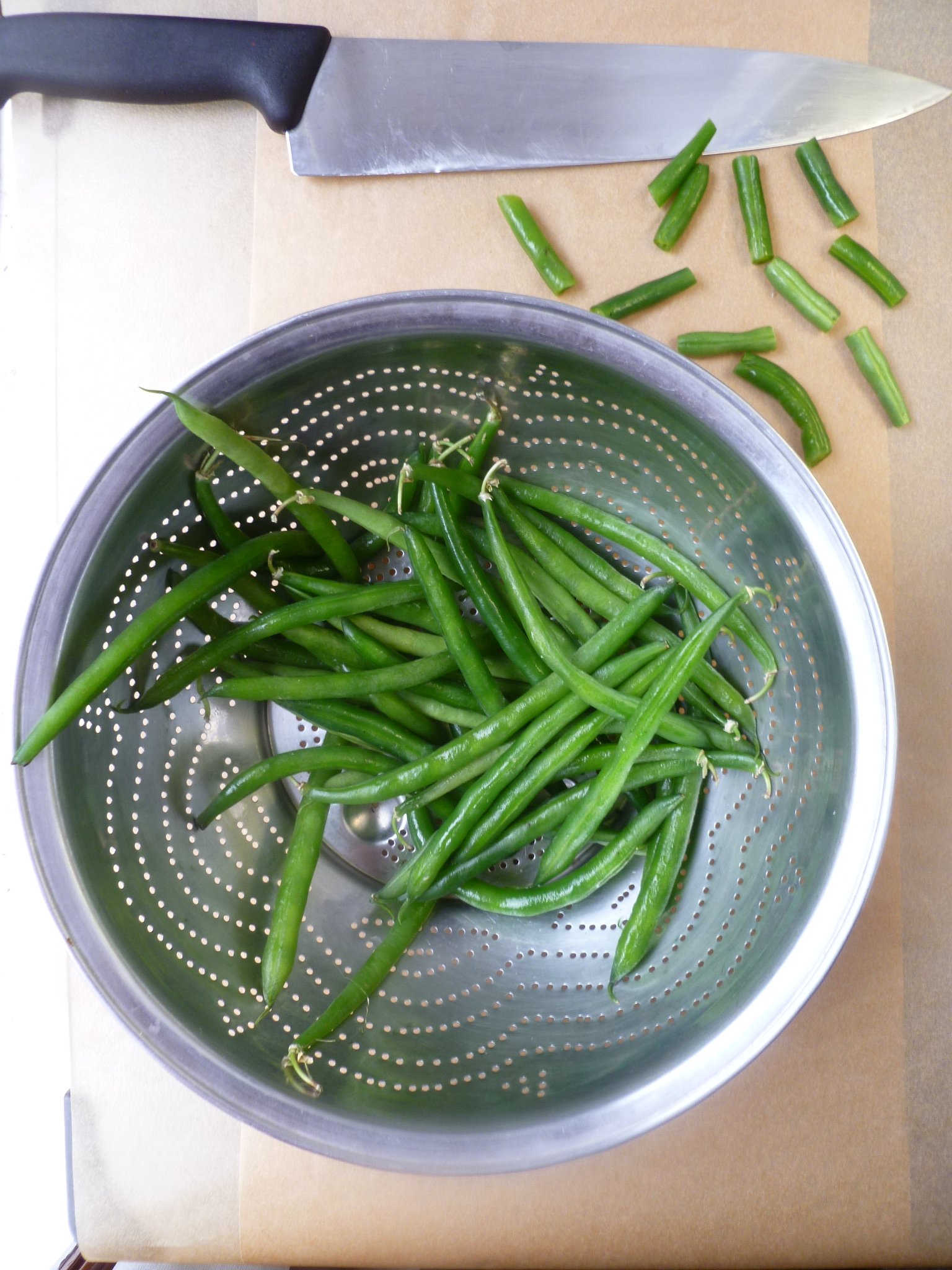 1. Trim the ends off the green beans and cut them into pieces about 2-inches long: