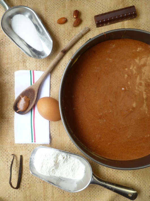 4. Mix in the melted chocolate and butter…then the flour…next, the ground almonds…and finally, the vanilla extract and almond extract.