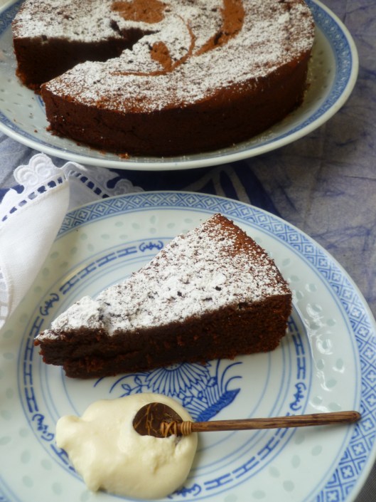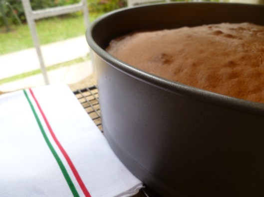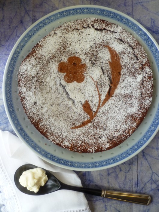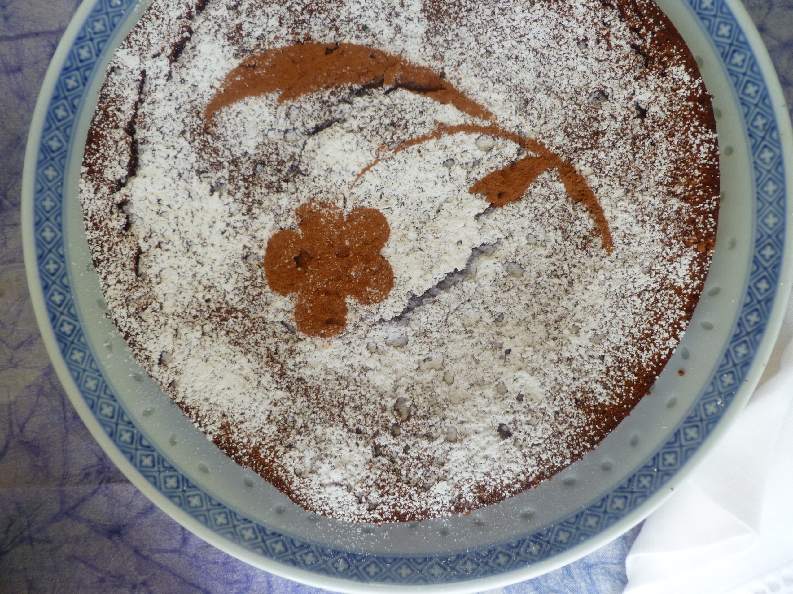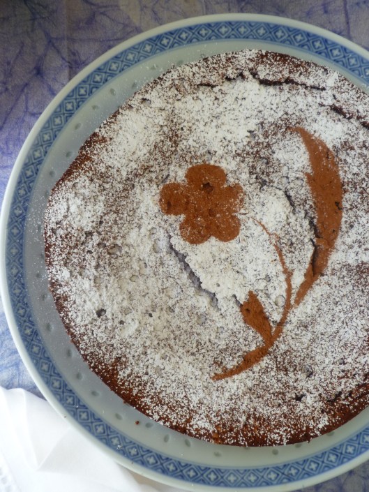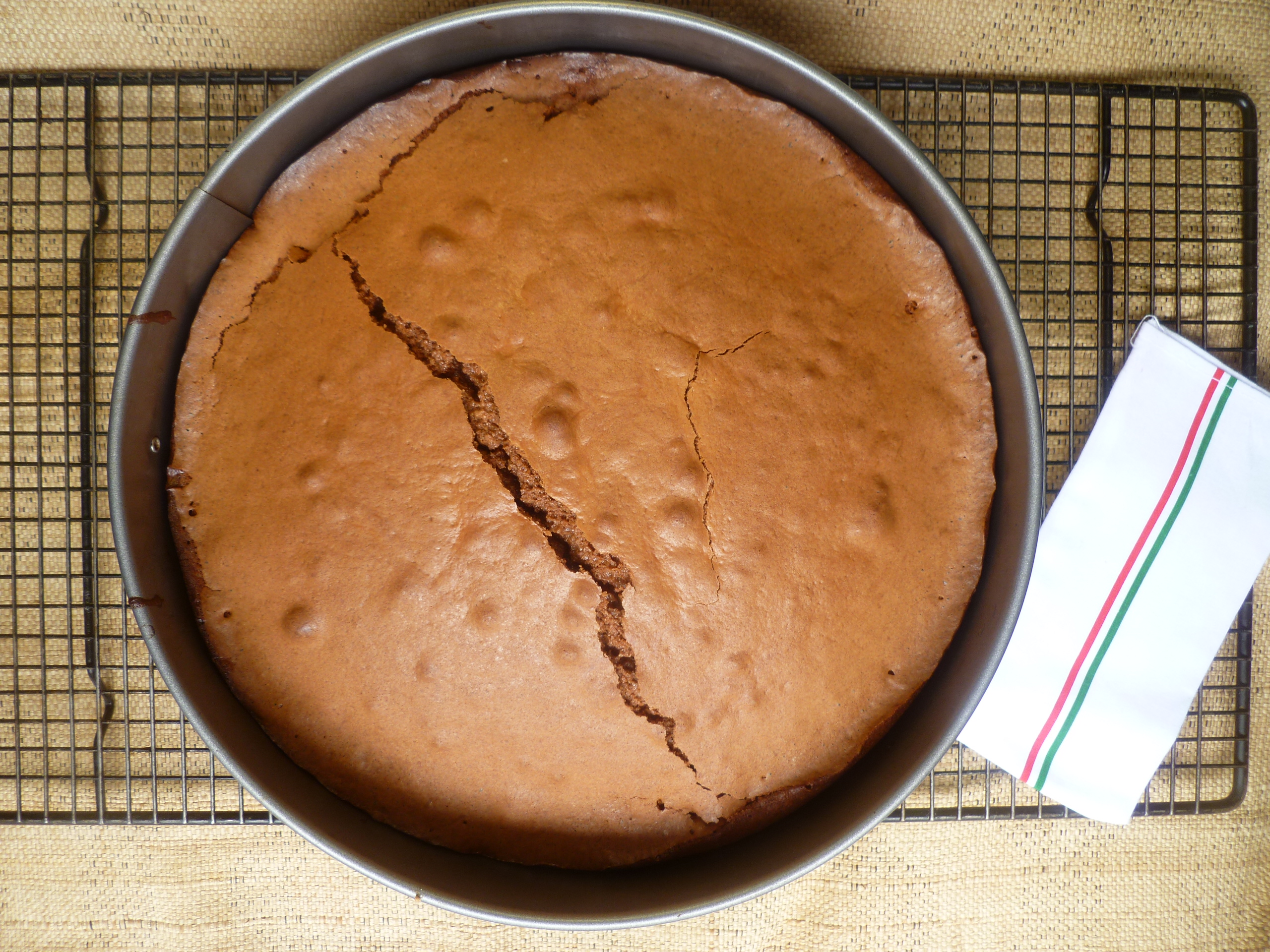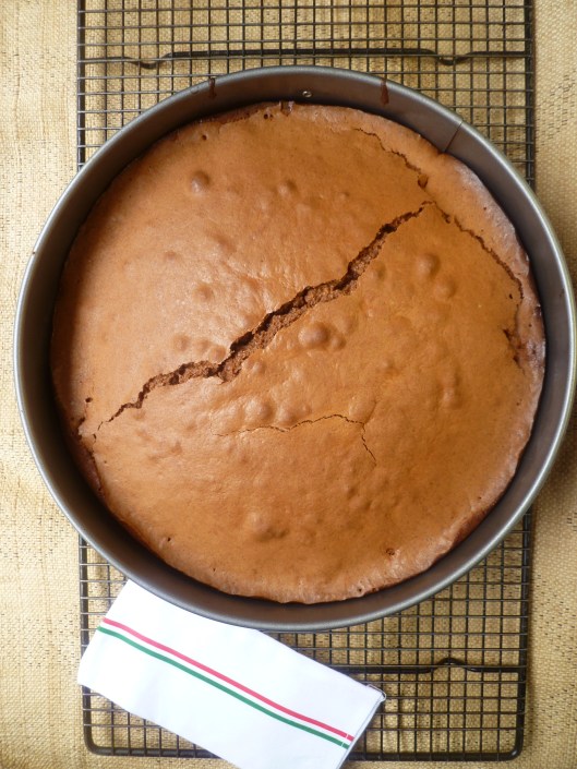 …As the cake cools, the top will crack. This is the nature of the cake. The ‘crackled’ surface has its own special texture and is powdered over with sugar and cocoa after the cake cools so that it will look pretty: