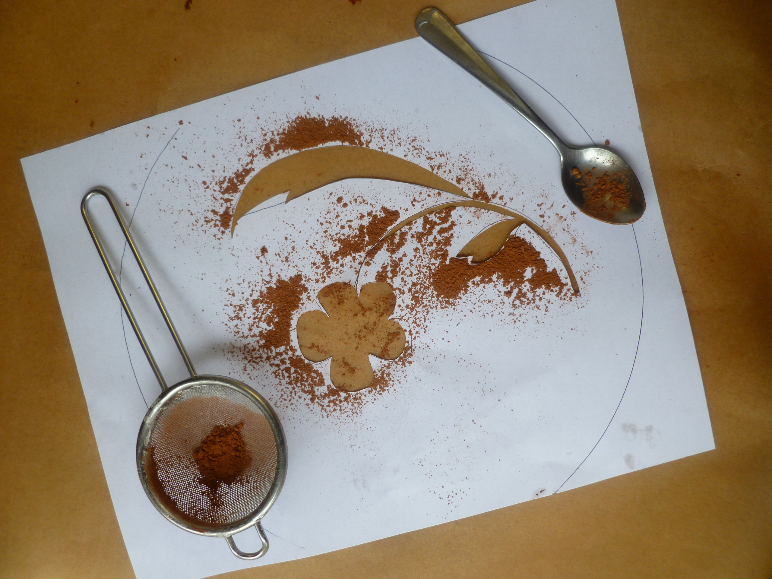 8. Sieve powdered sugar and then some cocoa over the top of the cake or make a simple stencil by tracing the form of the cake pan on a piece of paper, drawing a simple design in the middle and cutting it out with a pair of sharp scissors. Sieve powdered sugar over the cake. Then, place the stencil over the top of the cake and sieve cocoa powder over the cut-out portions…