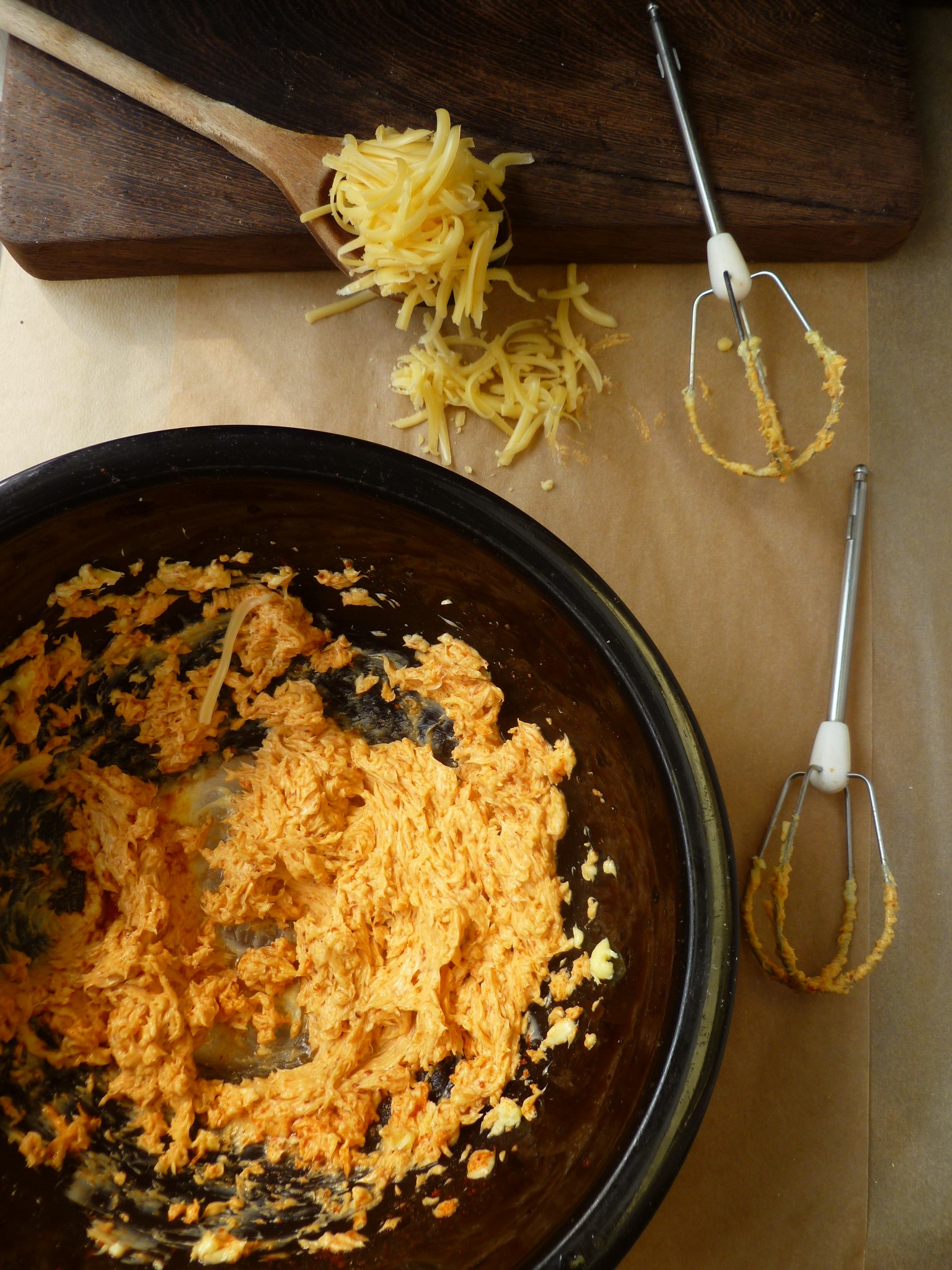 1. Put the grated Edam in a mixing bowl. Add the butter and mix it well into the cheese. (The mixture they form will be textured–not completely smooth.)