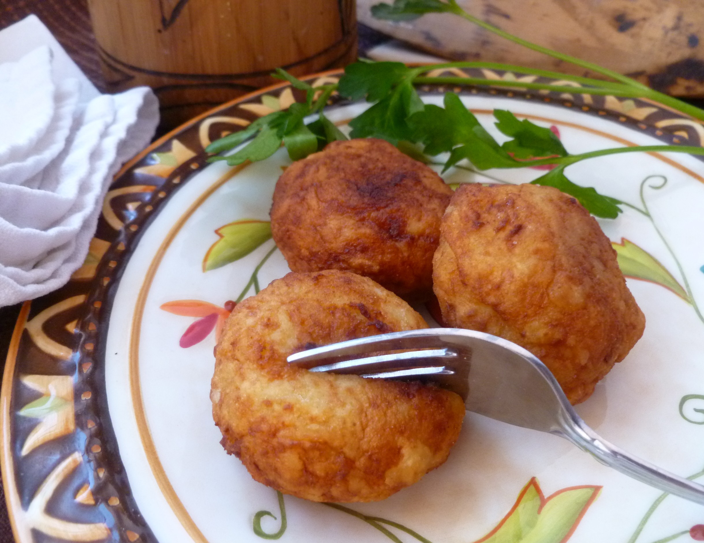 8. Heat the oil to 360 F (about 185 C) and place a few of the dumplings at a time in the hot oil to fry until they are golden. Stir the dumplings about gently with a slotted spoon to prevent them from sticking to the bottom of the pot. They will fry in about 3 minutes. Drain them and fry the rest in the same way.