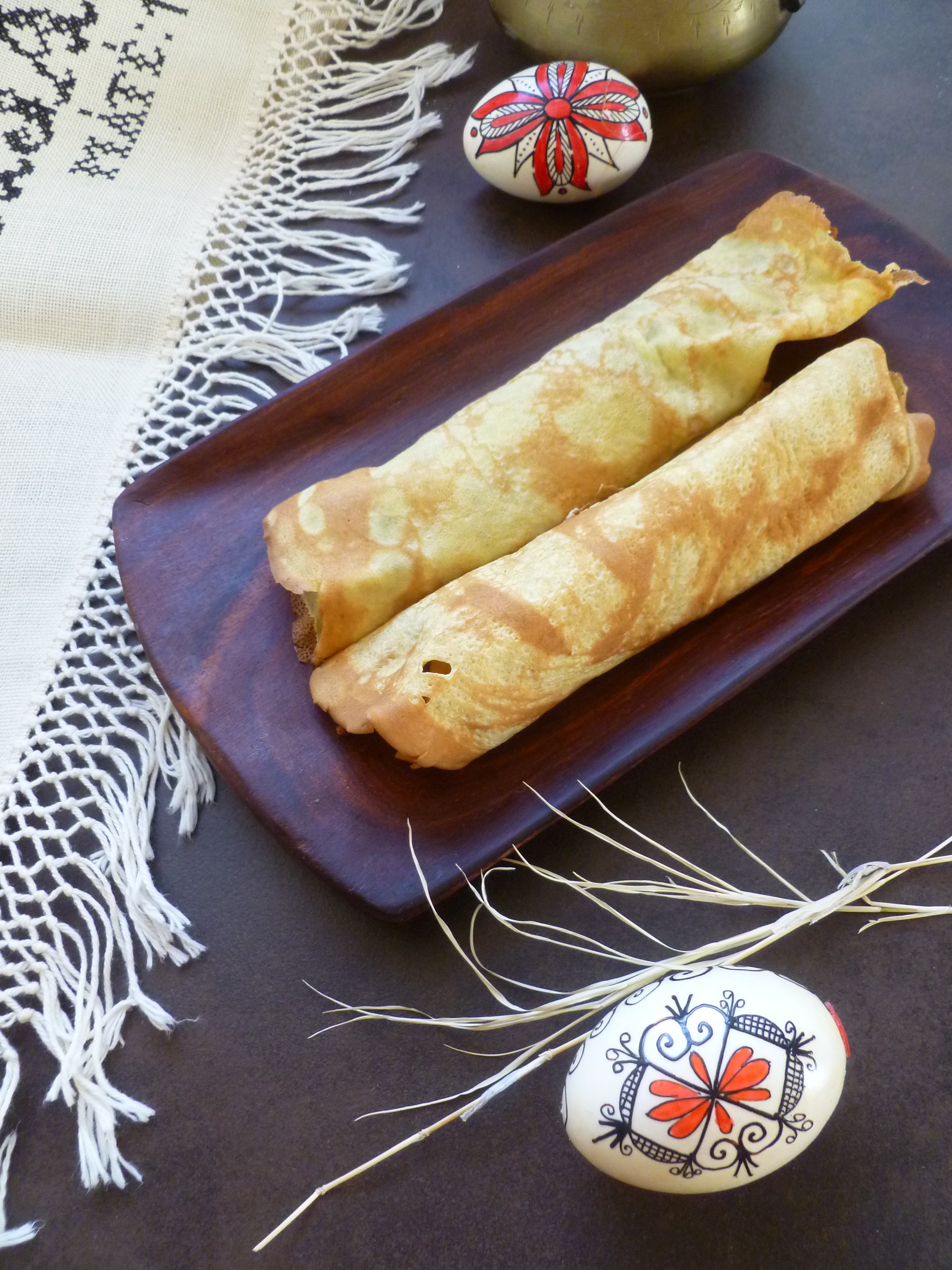 You will not find Fleischomeletten on a Swiss restaurant menu. You will find them–made with care and greeted with enthusiasm–in Swiss homes. In appearance, Fleischomeletten resemble crêpes or German pancakes. But the ‘Omeletten’ are much ‘eggier’ and, unlike either their French or German counterparts, may not be made in advance and successfully reheated. They require the cook to spend a little time in the kitchen making them right before serving. This lends a personal touch and a certain homestyle informality to any menu that includes them. Fleischomeletten are a treasured feature of Swiss celebrations at home. The joyful observance of Easter with family and friends seems a fitting occasion to include them in the diplomatickitchen Menu: Easter Lunch.