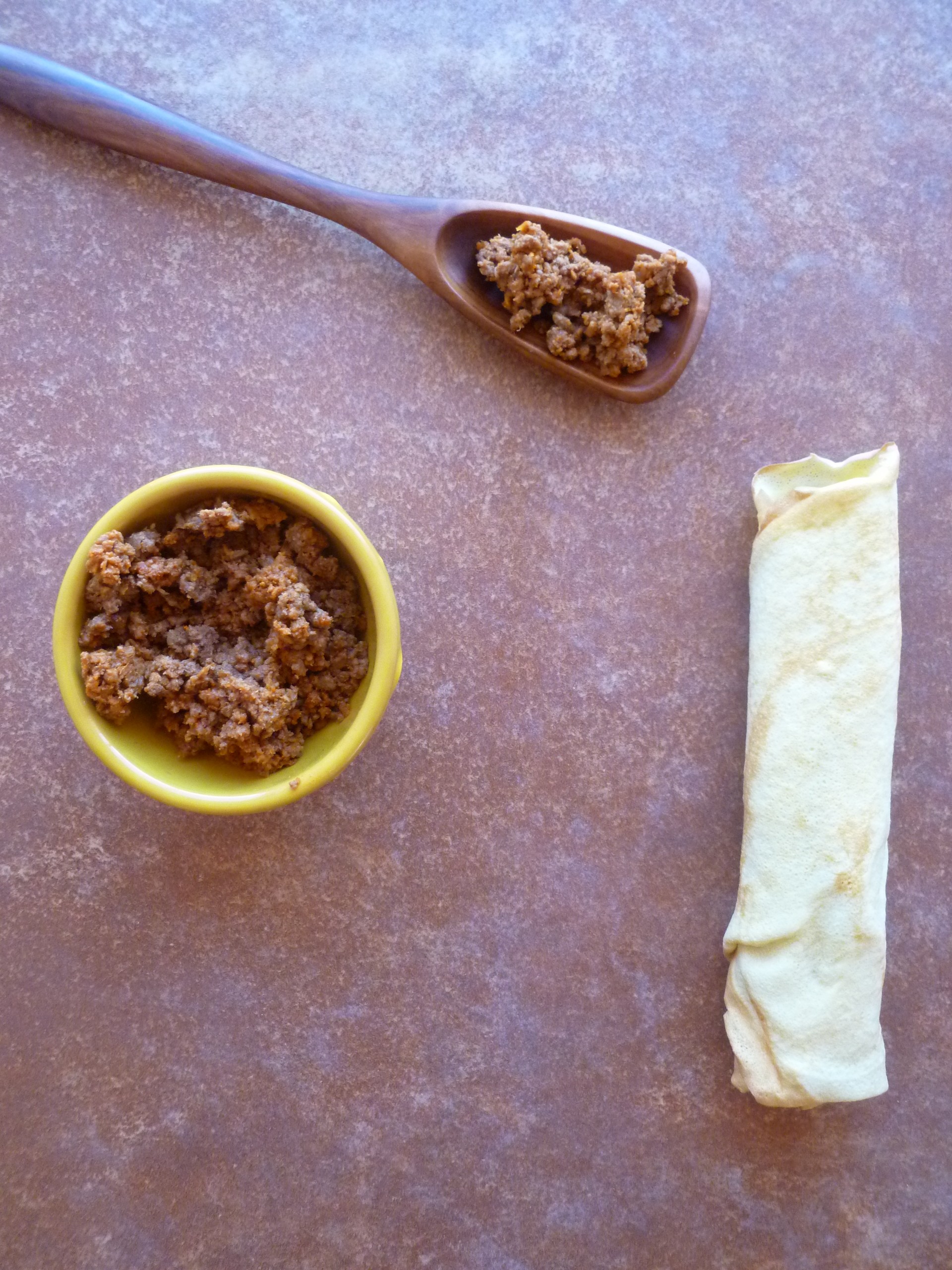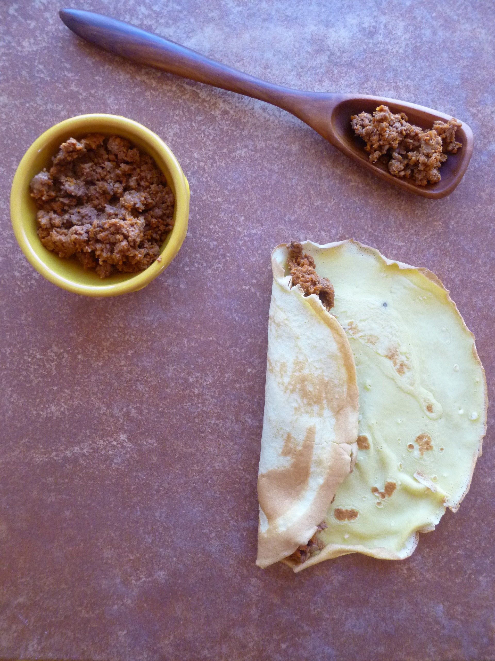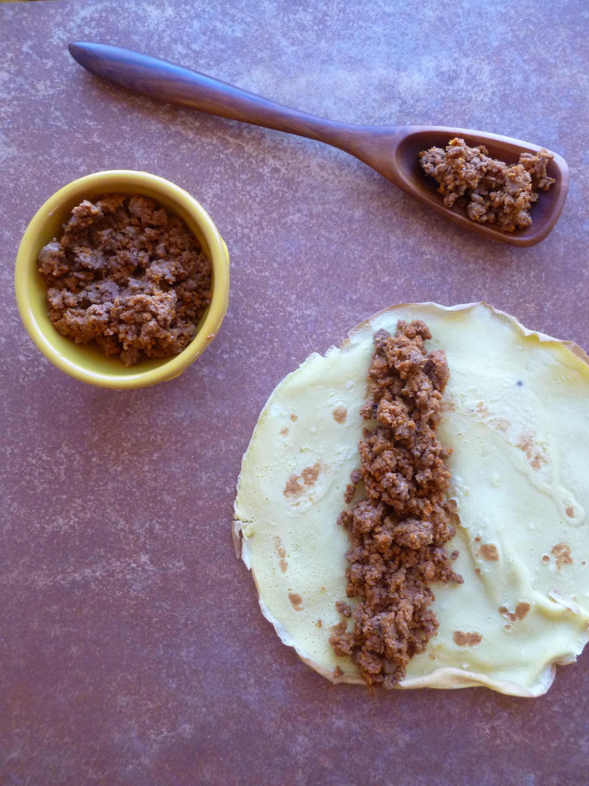 2. Spoon about 90 grams (a scant half-cup) of meat filling in a line, a little off-center to your left, down the ‘Omelette’ from top to bottom):