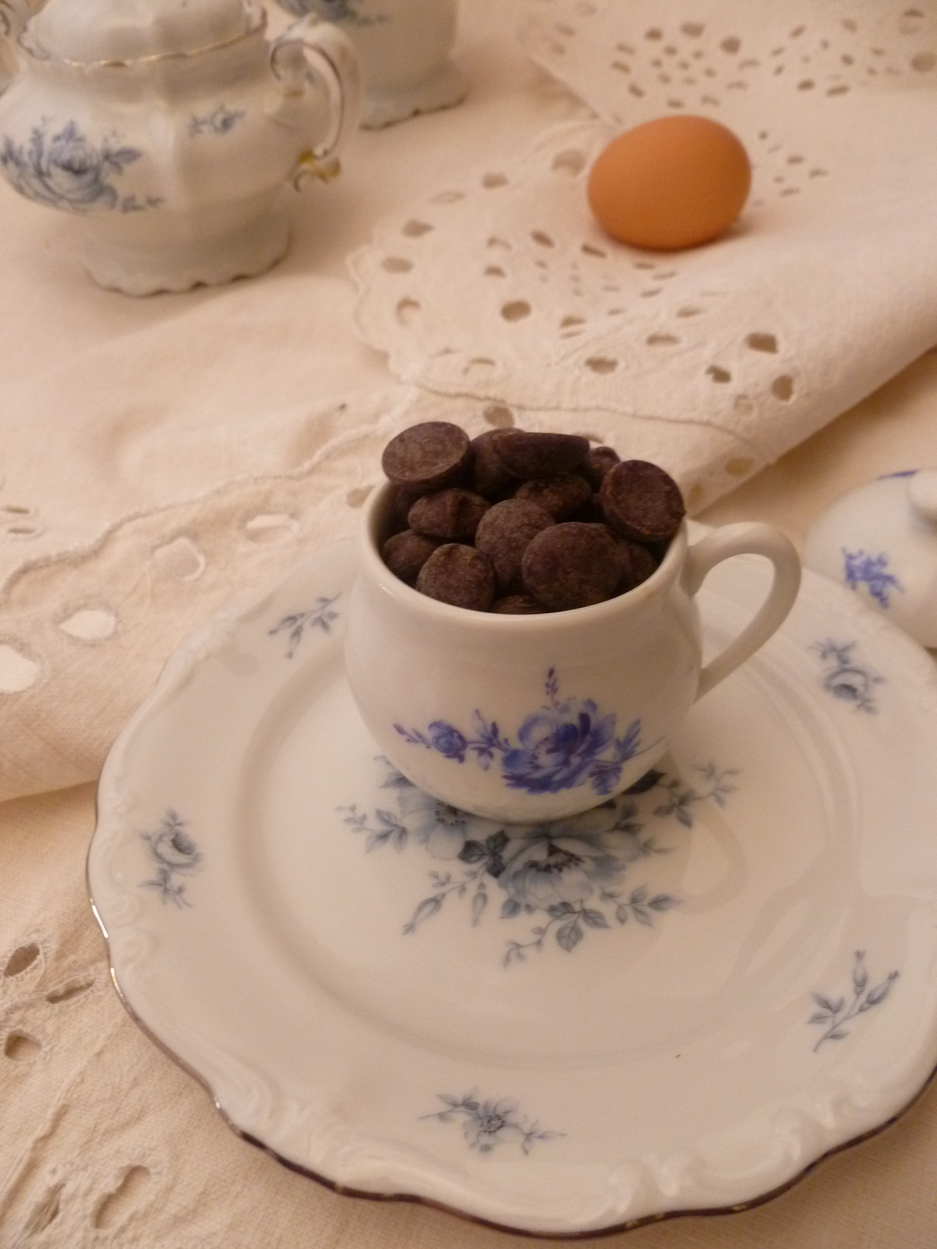 The ‘pots’ for Pots de crème au chocolat are not a requirement for making this dark chocolate cream. The dessert may very well be made in ramekins and it will taste every bit as good. (In taste and texture the baked cream resembles a dark chocolate truffle…which is why a small ‘pot’ goes a long way.) However, the special charm of the dessert is in the tubby little lidded ceramic ‘pots‘ in which the cream traditionally is baked. As someone once delightedly observed, “They look like something Mrs. Tiggy-Winkle might serve to her guests.” (Anyone unacquainted with Mrs. Tiggy-Winkle may view her portrait and read a brief biography here.)