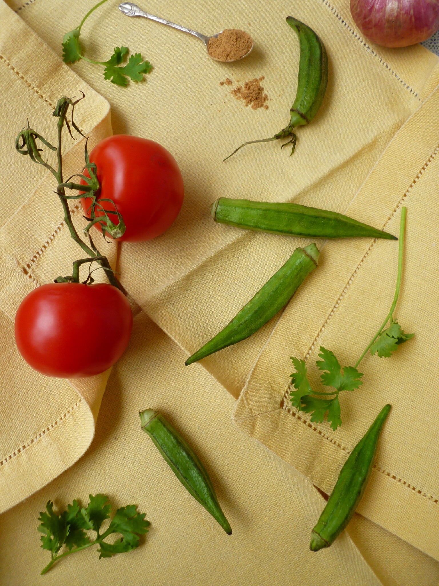 Timing Note: This way of preparing okra should be served at room temperature. The okra may be fried in advance and the other ingredients cut up and set aside and everything mixed together just before serving. The fried okra and cut-up shallots, tomato, coriander and spices may be packed separately to take along on a picnic and mixed together ‘in situ’.