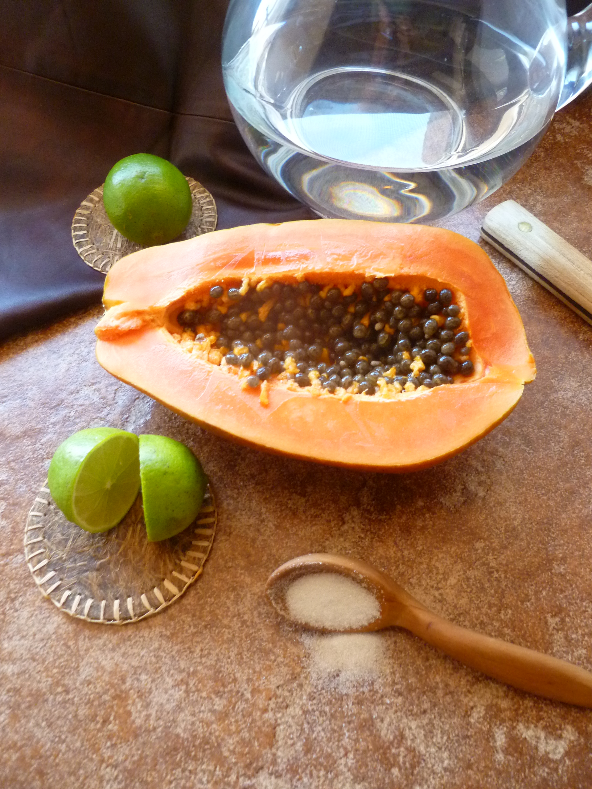 aqua fresca and greens with sass 051Papaya Aqua Fresca (for about 6 1-cup size glasses)