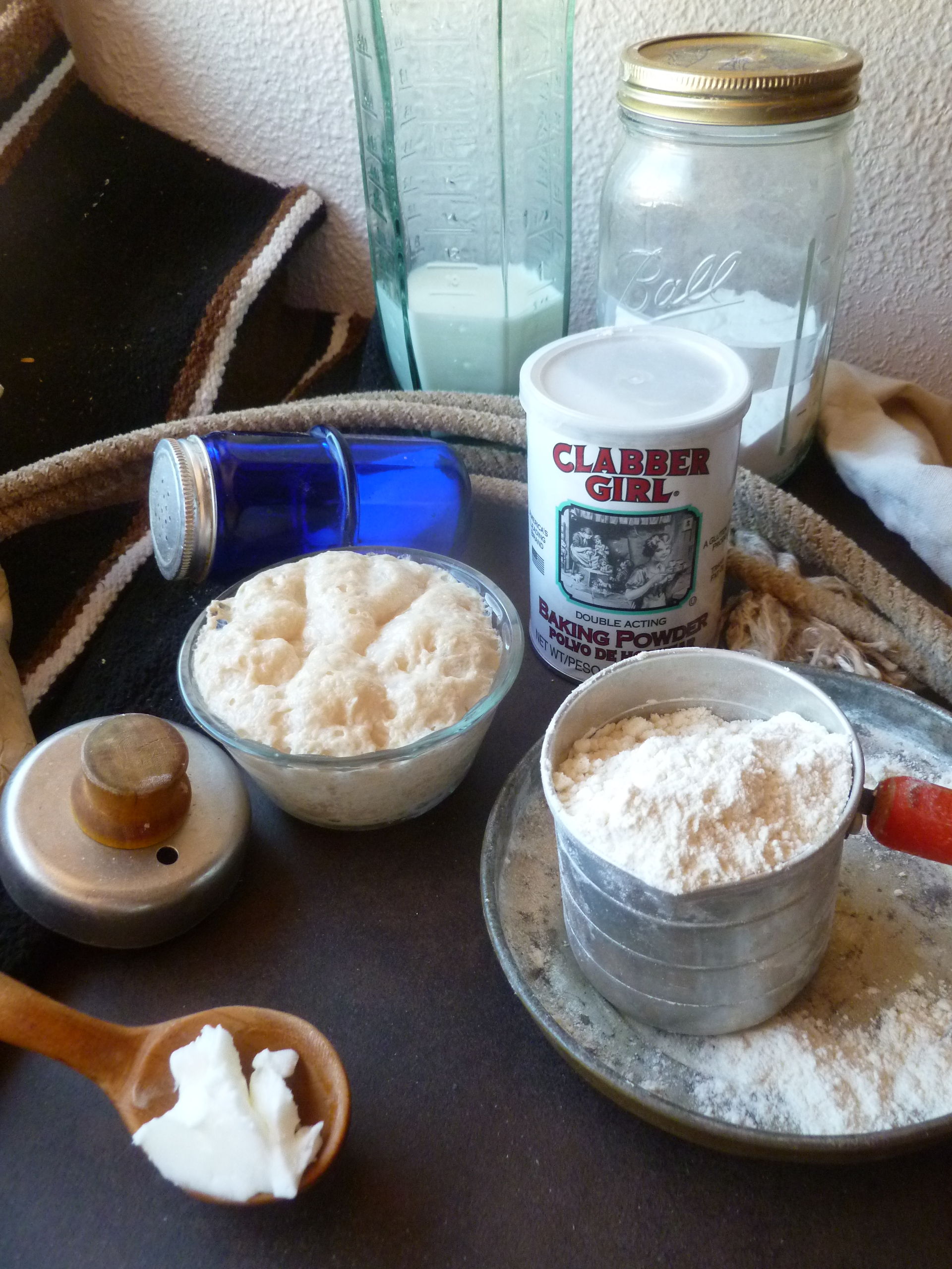 2. Preheat the oven to 475 F. To the mixing bowl add the flour, baking powder, baking soda, salt, and the 1/8 cup of sugar. Add the solid vegetable shortening and rub it into the dry ingredients with your fingers until pieces of shortening are no longer visible.