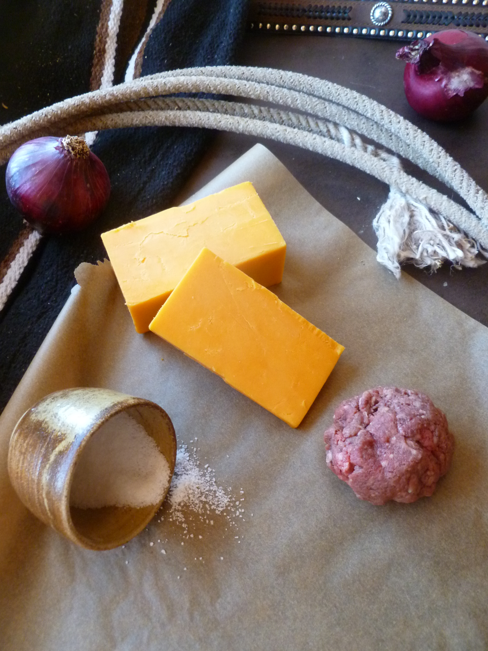 1. Mix together the ground meat, cheese, onion, salt and pepper and divide it into 8 balls. Flatten the balls into patties about 1/2-inch thick. Brush a little vegetable oil over both sides of them. (Buffalo meat is quite lean and the oil helps prevent the patties from sticking to the grill rack.)