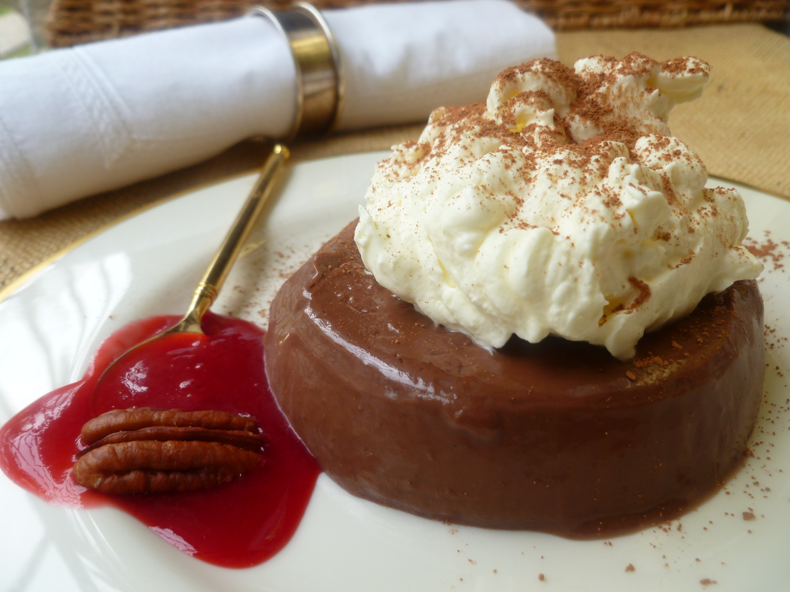 - Optional decoration: a spoonful of Raspberry Coulis and a toasted Pecan Half for each dessert