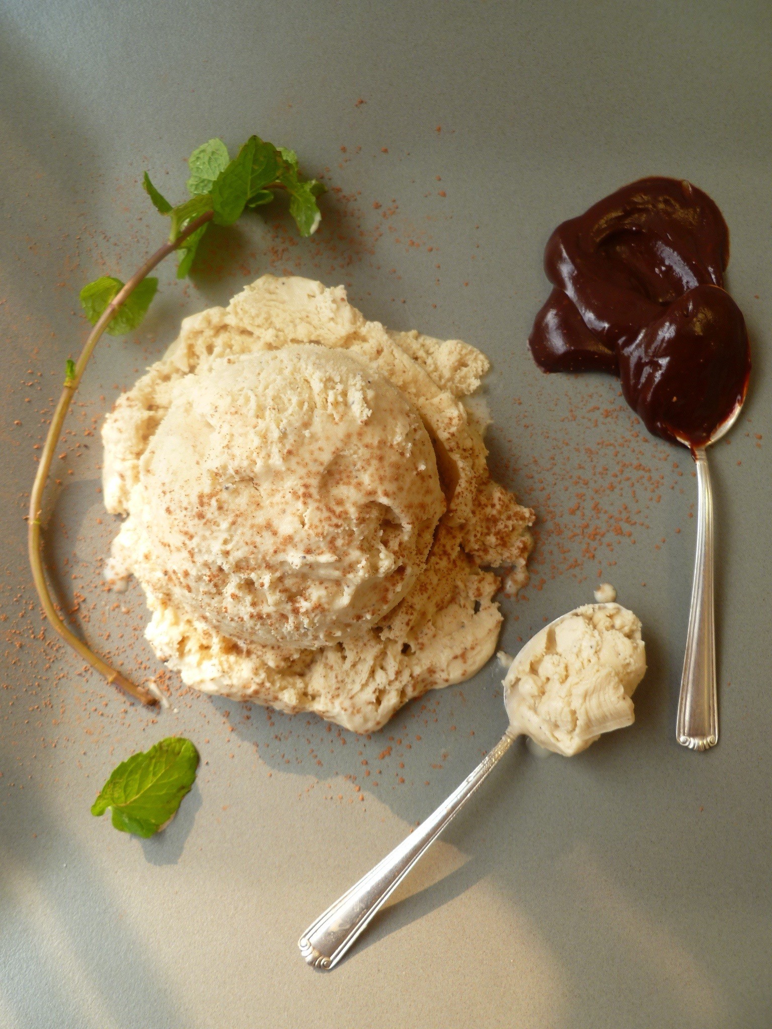 Homemade Coffee Ice Cream and Dark Chocolate Sauce